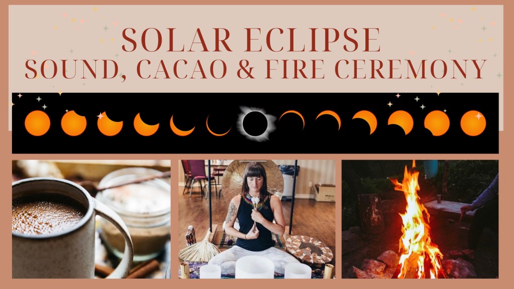 Join us for an afternoon to transmute what no longer serves you through the assistance of sacred cacao while raising your frequency through a magical sound journey held by Cindy Lynn of Vibrational Alchemy, and then move to the sacred fire for assistance in transforming what no longer serves you. This will take place in our enchanted outdoor space (weather permitting), to the transformative sounds during the precise peak of the solar eclipse. This all to begin anew to align with and create a life that better suits you. The momentary darkening of the sky can be interpreted to signify the completion of old patterns, paving way for new and exciting opportunities. This time of reflection offers insight into how we can realign our intentions, focus our goals, and cultivate intention for a brighter future.
